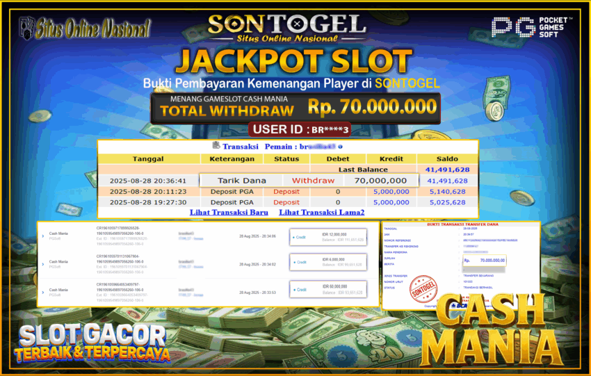 Selamat Kepada Member SONTOGEL dengan USER ID : BRA*** SLOT CASH MANIA di PG Soft sebesar RP.70.000.000,- LUNAS langsung di transfer ke rekening member tanpa kurang sepeserpun. Terimakasih telah mempercayakan SONTOGEL sebagai Situs Online Terpercaya dan Aman! Jangan tunggu tunggu lagi! langsung saja daftarkan akun bermain di SONTOGEL dan dapatkan bonus berlimpah setiap minggunya.