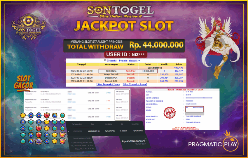 Selamat Kepada Member SONTOGEL dengan USER ID : NIZ*** SLOT STARLIGHT PRINCESS 1000 di PRAGMATIC sebesar RP.44.000.000,- LUNAS langsung di transfer ke rekening member tanpa kurang sepeserpun. Terimakasih telah mempercayakan SONTOGEL sebagai Situs Online Terpercaya dan Aman! Jangan tunggu tunggu lagi! langsung saja daftarkan akun bermain di SONTOGEL dan dapatkan bonus berlimpah setiap minggunya.